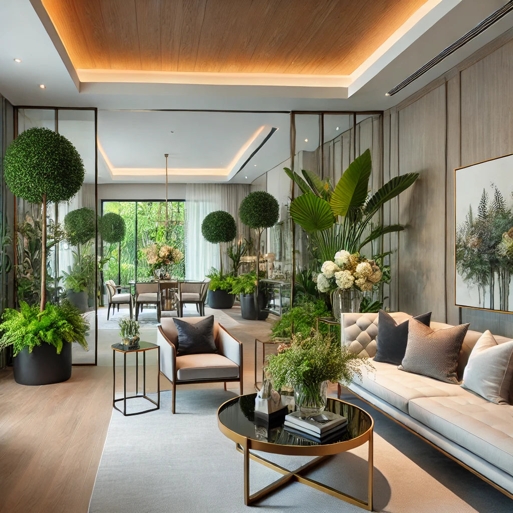 DESIGN INTÉRIEUR : Chez GRÜN, nous concevons et créons des plantes artificielles et des compositions florales de haute qualité pour les maisons et les appartements. En utilisant des jardinières et des conteneurs élégants, nous coordonnons parfaitement nos conceptions pour correspondre aux couleurs et au style de chaque pièce ou espace.